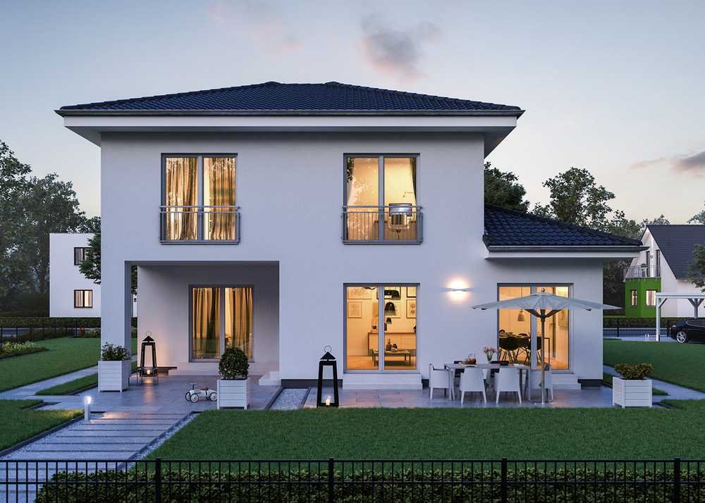 Mit einer modernen und extravaganten Architektur wird Sie das Einfamilienhaus LifeStyle17.02W auf rund 175m² Nettowohnfläche rundum überzeugen. Durch das harmonisch gestaltete Walmdach und das besondere Formenspiel der abgestuften Geschosse wird der Charme einer eleganten Stadtvilla gekonnt zum Ausdruck gebracht. Aus dem offenen Wohn-, Ess- und Küchenbereich führt der Weg durch große, 3-fach verglaste Türen hinaus in den Garten. Im Inneren unterstützen frei gestaltbare Raumzuschnitte eine kreative Raumnutzung – und sorgen mit serienmäßig höheren Wänden (275 cm) für ein atmosphärisch stimmiges Raumgefühl. Die vielen bodentiefen und großen Fenster bringen viel Licht und Sonne ins Haus. Im Obergeschoss befinden sich das Arbeitszimmer und 2 Kinderzimmer mit eigenem Bad. Ein Traum wird wahr .....