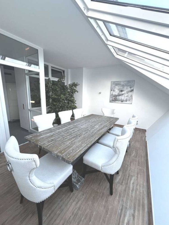 Über die elegante Holztreppe mit Edelstahlhandlauf erreichen Sie die obere Etage der Wohnung. Hier empfängt Sie ein heller Flur, der zur Linken ein großzügiges Wohnzimmer mit ausgebautem Dach anbietet. Eine Schiebetür rundet den Raum ab. Auf dieser Ebene befindet sich, halb offen, die hochwertige Einbauküche mit Miele Elektrogeräten, die keine Wünsche offenlässt. Der Essbereich liegt direkt im Bereich vor der Küche. Von hier aus gelangen Sie durch ein Schiebeelement in das Highlight dieser Wohnung: der außergewöhnliche Wintergarten, ehemalige Loggia, die durch großzügige Fensterelemente geschlossen wurde und Ihnen die Möglichkeit bietet, ganzjährig eine Terrassenatmosphäre zu genießen.