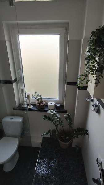 Am Ende des Flurs, zwischen Schlaf- und Wohnzimmer, befindet sich das Badezimmer mit begehbarer Dusche. Es verfügt über ein Fenster, so dass der Raum mit Tageslicht und Frischluft versorgt ist. Zur Wohnung gehören noch ein Kellerraum und ein Stellplatz.
