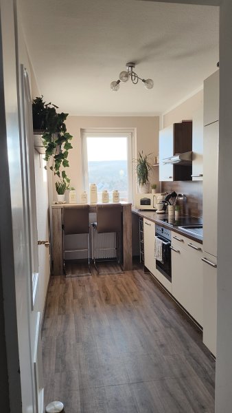 Die Küche liegt ebenfalls zur rechten Seite, nach Süden ausgerichtet. Eine praktische Einbauküche ist optional gegen Aufpreis zu erwerben. Zur linken des Flurs befinden sich 2-3 Wohnräume. Die vorherigen Eigentümer haben aus der ursprünglichen 4-Zimmer-Wohnung eine 3-Zimmer-Wohnung gemacht. Diese Arbeiten könnten aber auch wieder rückgängig gemacht werden, wenn Sie ein weiteres abgeschlossenes Zimmer benötigen sollten. Nebenan befindet sich das gemütliche Schlafzimmer mit Blick ins Calenberger Land.