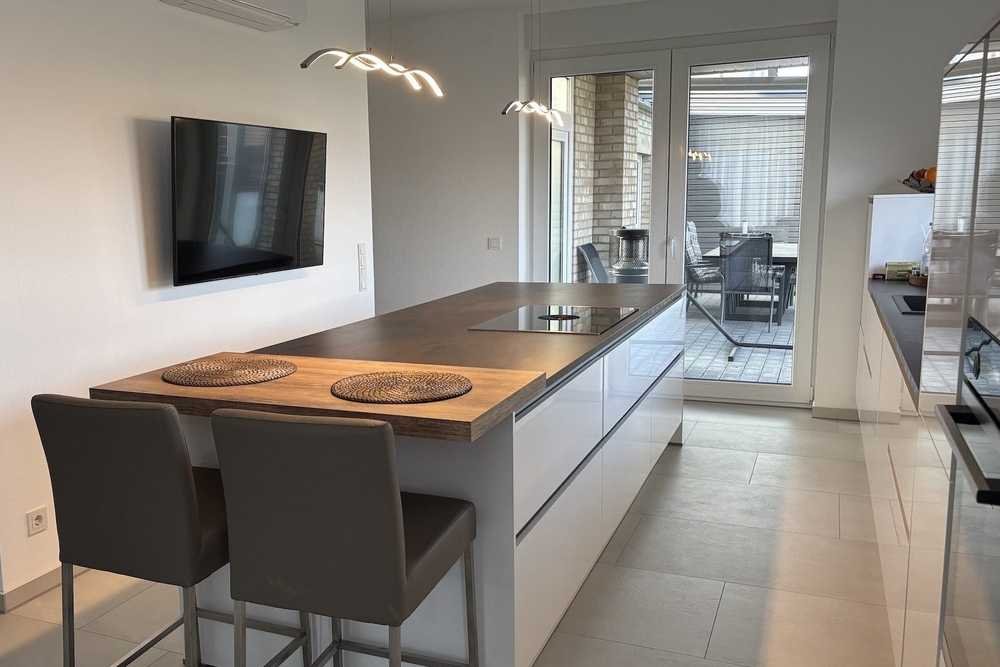 Ein besonderes Highlight ist die weiße, offene Einbauküche in edler Hochglanzoptik mit integrierter Kühl- Gefrierkombination - perfekt für Hobbyköche und Genießer. Ein gemütlicher Kamin steht im Wohnzimmer zur Verfügung.