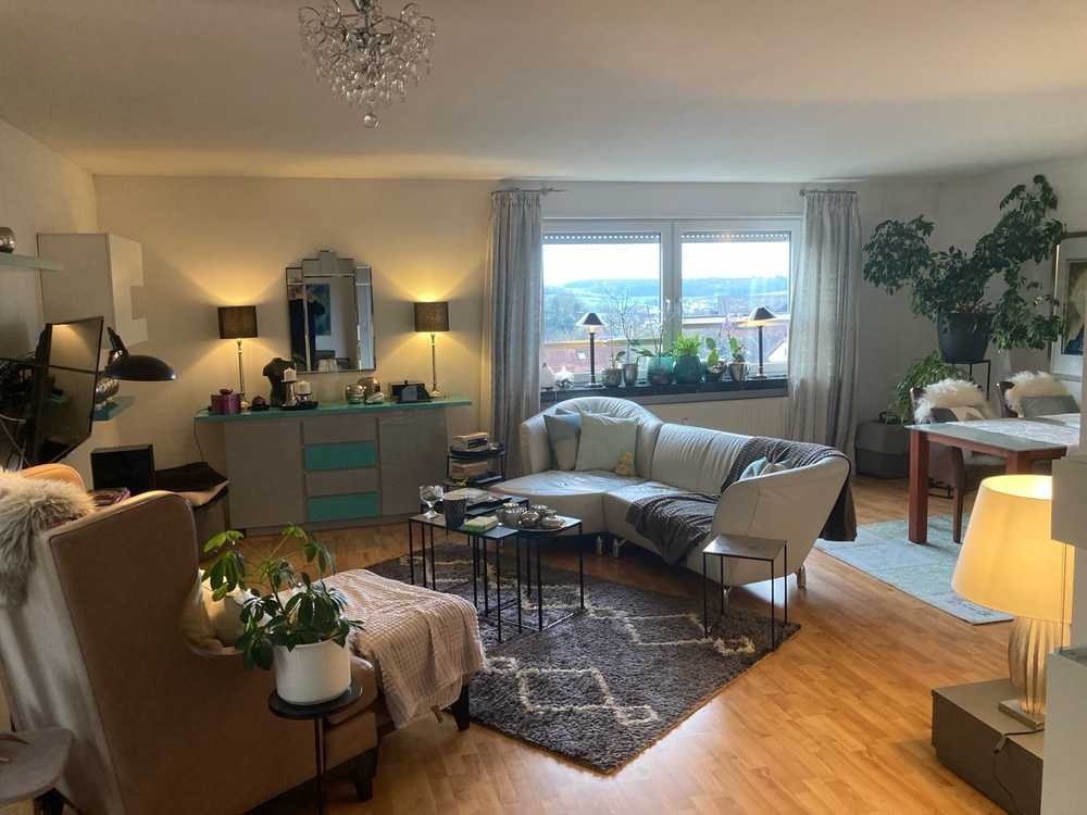 Vom großen, doppelflügeligen Wohnzimmerfenster aus genießen Sie einen beeindruckenden Blick auf Fulda und das historische Kloster Frauenberg. Dieser Ausblick sorgt für eine besondere Atmosphäre und bringt das natürliche Licht in das Herz der Wohnung.