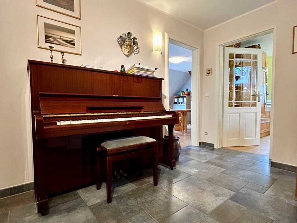 Vom Flur aus erreichen Sie alle Räume der Wohnung. Besonders hervorzuheben ist die Wendeltreppe, die vom Flur in den Dachboden führt. Der Dachboden bietet neben zusätzlichem Stauraum auch eine praktische Ausbaureserve. Das großzügige Esszimmer ist das Herzstück der Wohnung. Hier lassen sich gemütliche Stunden mit den Liebsten verbringen. Im hellen und freundlichen Wohnzimmer haben Sie ebenfalls viel Platz für ein geselliges Beisammensein. Die beiden gemütlichen Schlafzimmer fungieren als Rückzugsorte mit maximaler Privatsphäre. Die moderne Einbauküche ist hochwertig ausgestattet und bietet neben einem Sitzbereich auch viel Stauraum für Ihre Küchenutensilien. Neben dem Dachboden steht noch ein Keller als Abstellraum zur Verfügung.