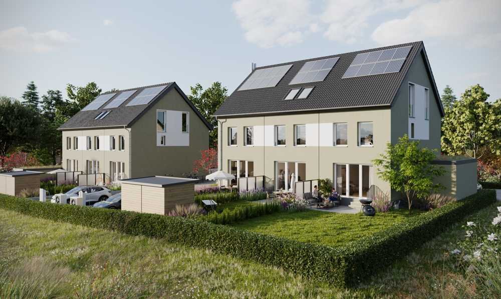 Im großzügigen Erdgeschoss befinden sich der offene Küchenbereich und das helle Wohnzimmer. Zusätzlich gibt es ein modernes Gäste-WC in diesem Bereich. Das Obergeschoss verfügt über zwei Zimmer, die als Schlafzimmer oder für andere Zwecke genutzt werden können. Außerdem gibt es ein Badezimmer mit einer Badewanne, einer Dusche, einem WC und einem Waschbecken. Das Badezimmer ist mit moderner Sanitärausstattung ausgestattet. Im Dachgeschoss befinden sich zwei weitere Schlafzimmer, die flexibel genutzt werden können, zum Beispiel als Kinderzimmer oder Büro. Es gibt auch einen großen Abstellraum im Dachgeschoss für zusätzlichen Stauraum. Alle Fenster in den Reihenhäusern sind schall- und energieeffizient dreifach verglast. Zusätzlich sind Außenrollläden angebracht, um den Lichteinfall und die Privatsphäre nach Bedarf zu regulieren. Zu jedem Haus gehört eine Terrassenfläche, die zum Entspannen und Verweilen einlädt sowie ein eigener kleiner Garten.