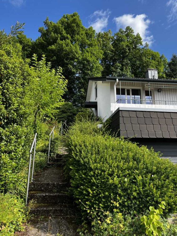 Erdgeschoss und Dachgeschoss ca. 170 qm, Schlafzimmer, Bad, Windfang mit Gäste-WC, zwei Wohnzimmer, eines mit Blick in Richtung Bäumbachtal, das andere zweigeschossig mit eingestellter Galerie, großzügige Verglasung, Küche mit angegliedertem Vorrats-/ Wirtschaftsraum, Essbereich mit Frühstücksterrasse, Arbeitsbereich. Zwei Kellerräume, Sauna, ein Heizungskeller.