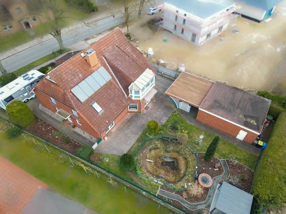 Das großzügige Grundstück ist hervorragend gestaltet und bietet eine gepflasterte Auffahrt mit einem Doppelcarport sowie eine Doppelgarage und weitere PKW-Außenstellplätze. Der liebevoll angelegte Garten ist vollständig eingezäunt und verfügt über einen idyllischen Gartenteich mit Steingarten, einen dekorativen Springbrunnen, gepflegte Blumenbeete sowie attraktive Ziersträucher. Eine überdachte Sitzecke lädt zum Verweilen und Entspannen im Freien ein.
