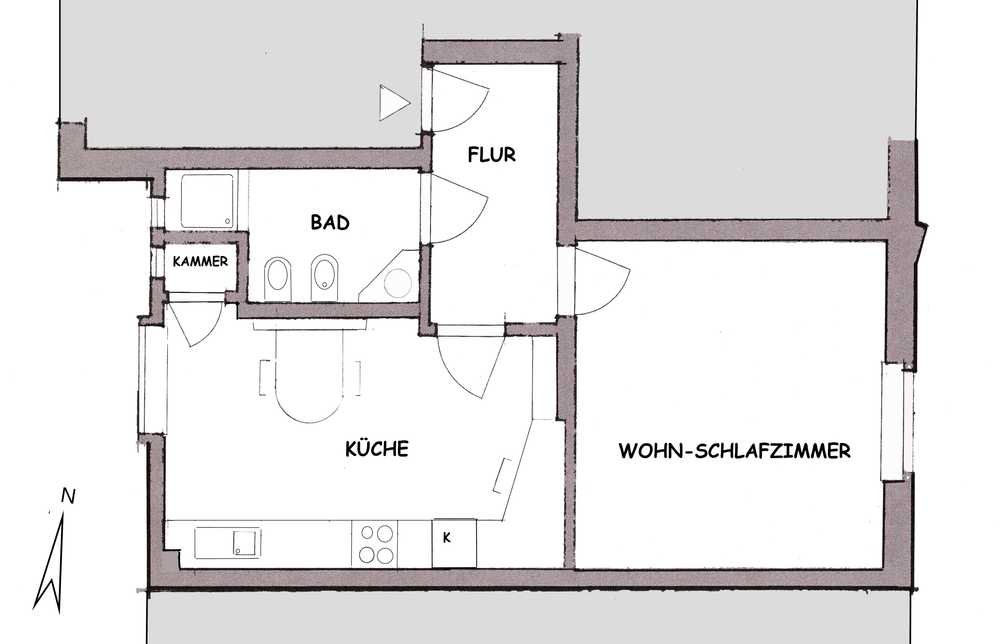 2. Etage ohne Aufzug. Wohnfläche: 41,5 m², gepflegter Zustand, 1 Zimmer 15,5m², Flur, großer Küchen-Essraum mit Einbauküche (optional), modernisiertes Bad mit Bidet, Abstellkammer, Kellerraum, Nichtraucherwohnung, kein Balkon.