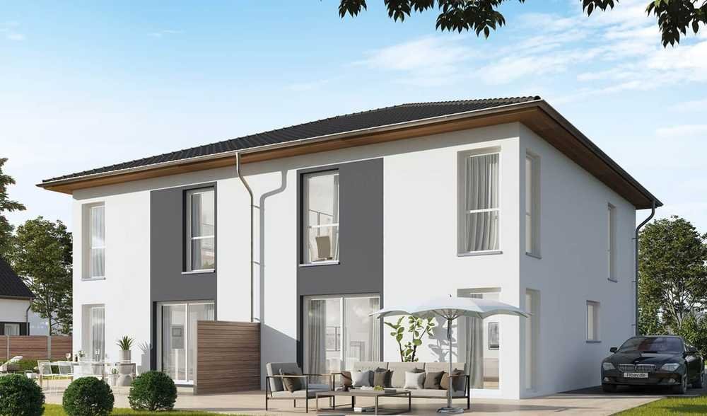 Ihr neues Zuhause. Eine individuell geplante Doppelhausstadtvilla für dieses Grundstück ohne Dachschrägen, auf 134 qm Wohnnutzfläche, mit 5 Zimmern und einem Grundstücksanteil von 440 qm pro Haushälfte.