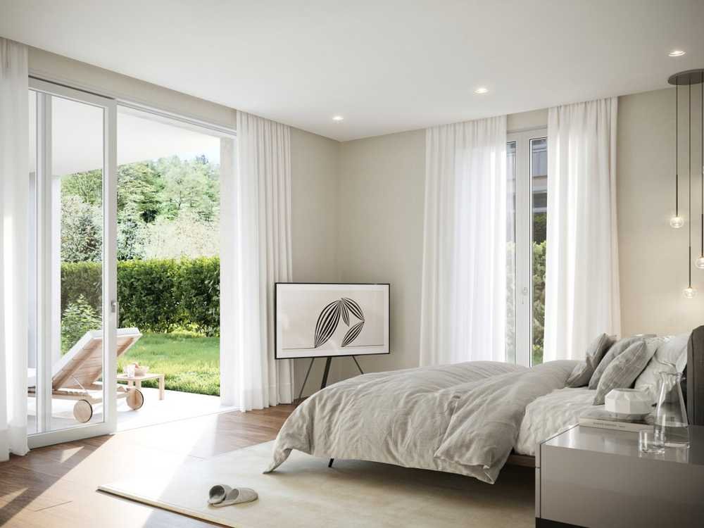 Das ruhige Schlafzimmer ist ebenfalls von Licht durchflutet und bietet mit dem großzügigen Badezimmer eine private Rückzugsoase mit besonderem Wohlfühlcharakter.