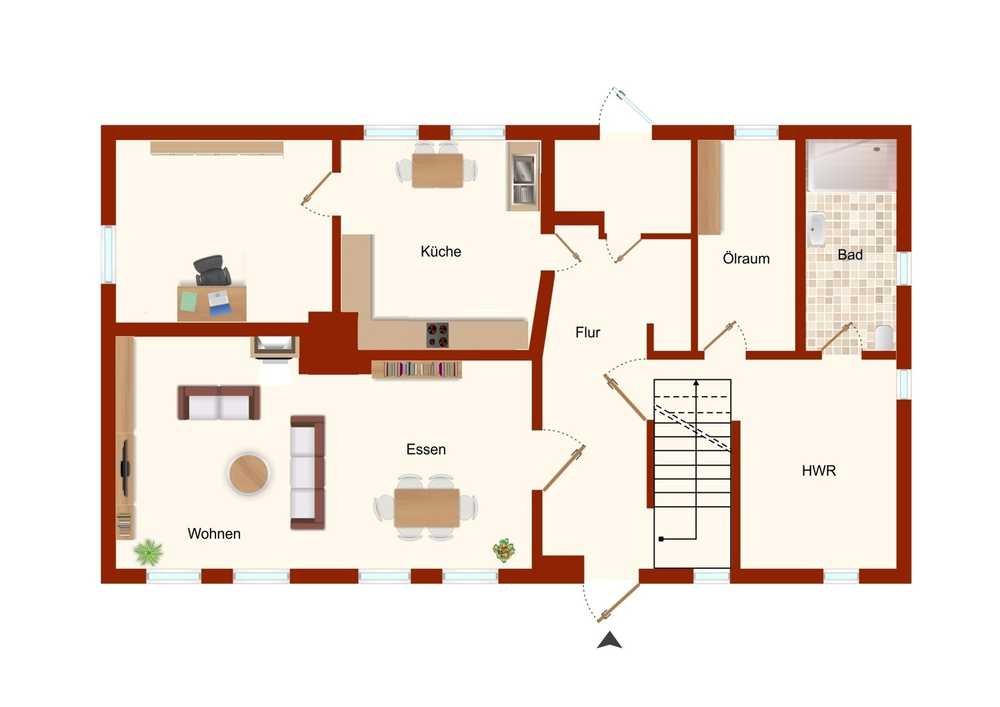 Zusätzlich stehen im Erdgeschoss das moderne Duschbad, ein Hauswirtschaftsraum, der Heizungsraum, sowie ein 2. Zimmer zur Verfügung, das man durch die gemütliche Wohnküche erreicht .
