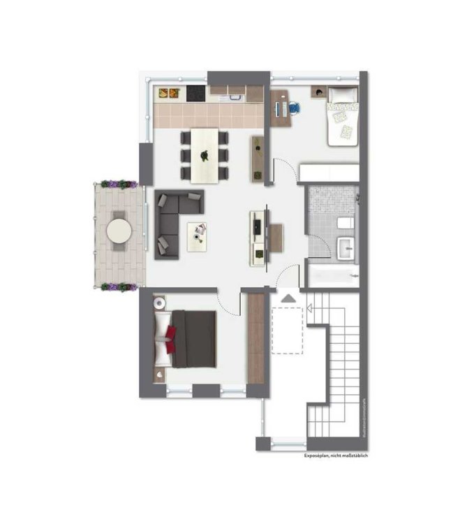 Die Wohnungen sind mit einem Balkon, oder einer großen Terrasse mit Gartenfläche ausgestattet.