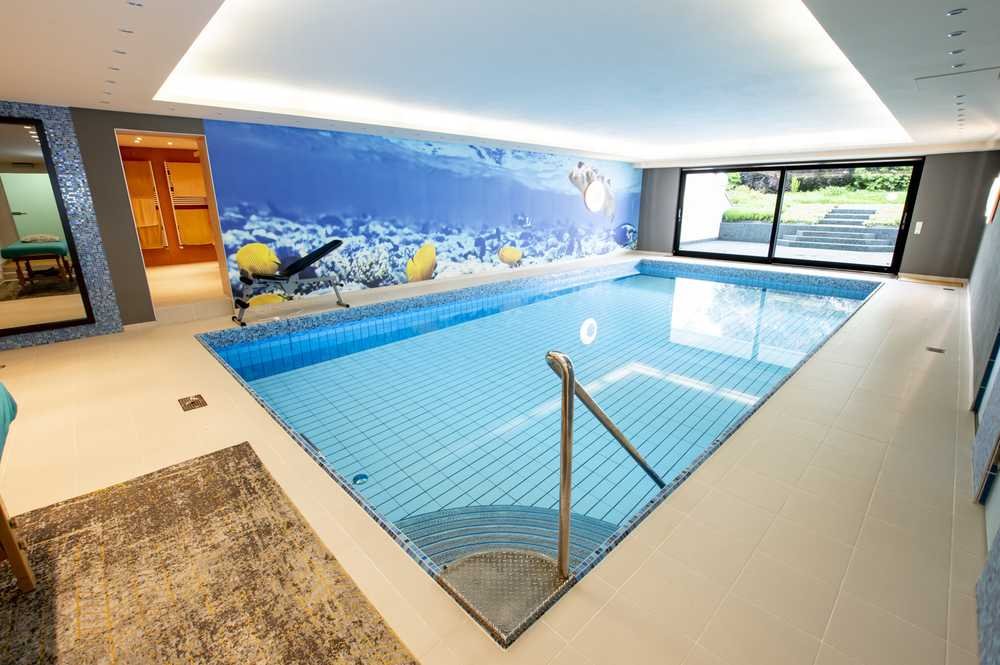 Im unteren Bereich der Immobilie kommen Wellnessliebhaber voll auf ihre Kosten: Eine lichtdurchflutete Schwimmhalle mit beheiztem Pool - beeindruckende 5x10 Meter groß - ein hochwertiger Fitnessbereich sowie eine moderne Sauna für bis zu sechs Personen sind bereits inkludiert und sorgen für ein luxuriöses Spa-Erlebnis im eigenen Zuhause.