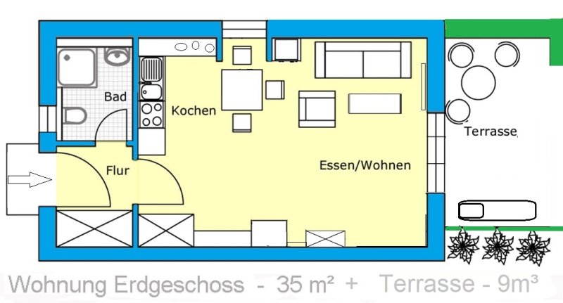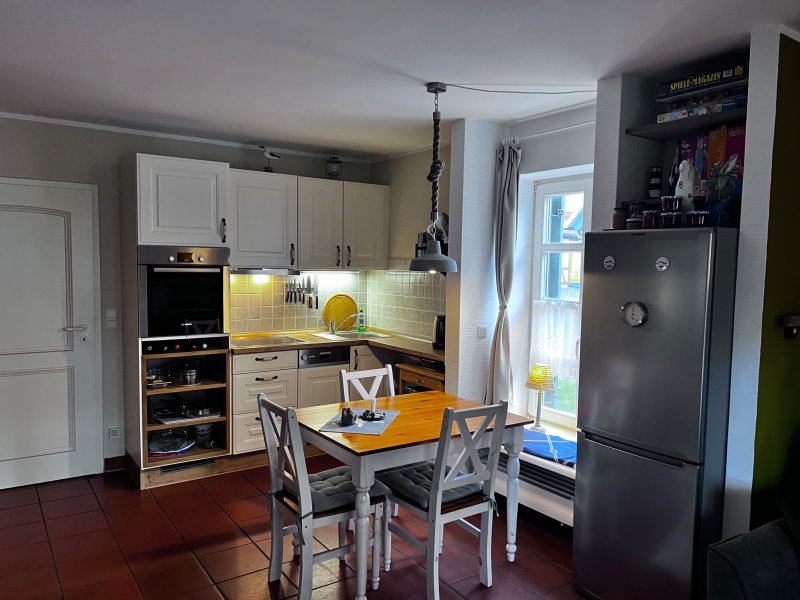 Die Wohnung wird möbliert verkauft. Die komplett ausgestattete Küchenzeile mit Kaffeemaschine, Toaster, Wasserkocher, 4 Herdplatten Cerankochfeld, Backofen, Kühlschrank mit 3 Gefrierfächern und kompl. Geschirr sorgt für ein Rundumpaket. Auf der Terrasse stehen die notwendigen Gartenmöbel sowie ein 3m großer Gartenschirm zur Verfügung.