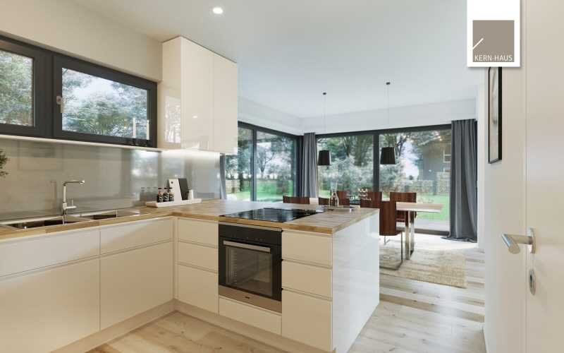 Wenn Sie die Diele des Architektenhauses Allea betreten, haben Sie Blick in den großen Wohn- und Essbereich. Durch bodentiefe Schiebeelemente ist dieser Bereich lichtdurchflutet und Sie können sowohl vom Sofa als auch vom Esstisch in den Garten schauen. Architektonisches Highlight des Familienhauses ist der Erker mit drei Fensterelementen, in dem das Esszimmer untergebracht ist. Die offene Küche grenzt direkt an das Esszimmer, ist aber auch von der Diele aus betretbar. Insgesamt umfassen Küche und Wohn-Essbereich mehr als 46 Quadratmeter. Im Erdgeschoss befinden sich zudem ein Home-Office, eine Garderobe sowie ein WC.