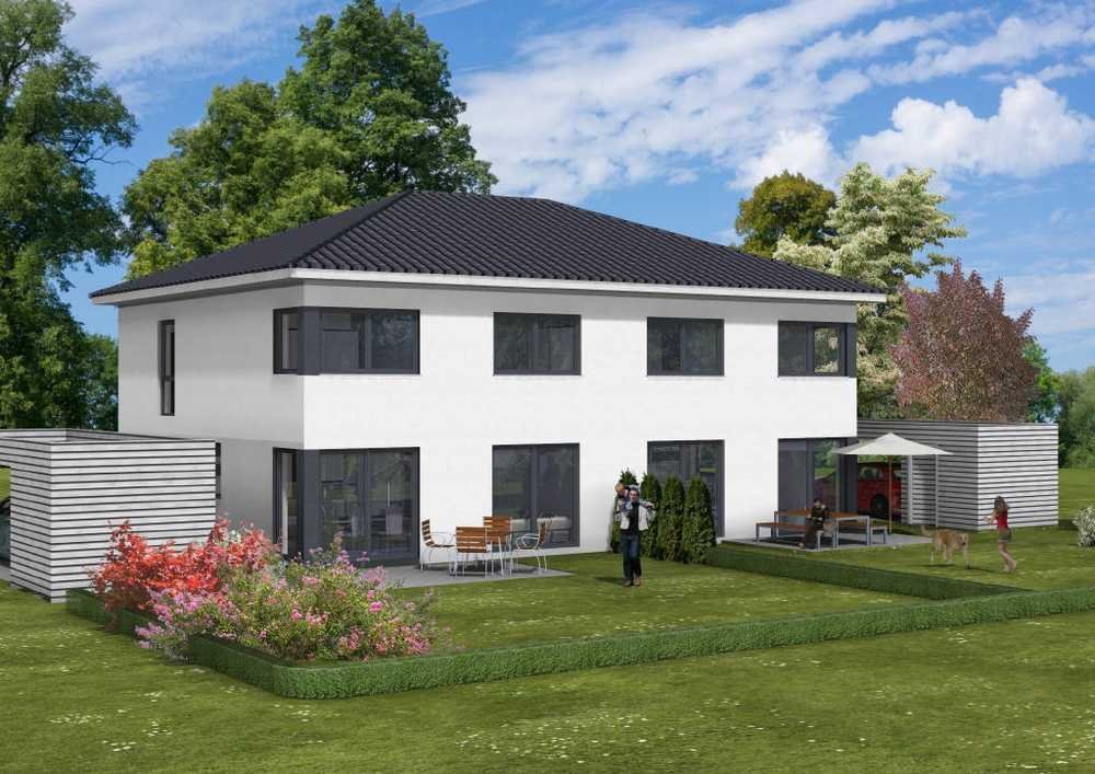 Die hier angebotene, schlüsselfertige Doppelhaushälfte befindet sich auf der östlichen Seite des Grundstücks und bietet auf einer Grundstücksfläche von 332 m² Platz zur individuellen Gestaltung und zum Wohlfühlen. Die Eingänge der beiden Haushälften sind gegenüberliegend angeordnet, wodurch ein hoher Grad an Privatsphäre gewährleistet ist.