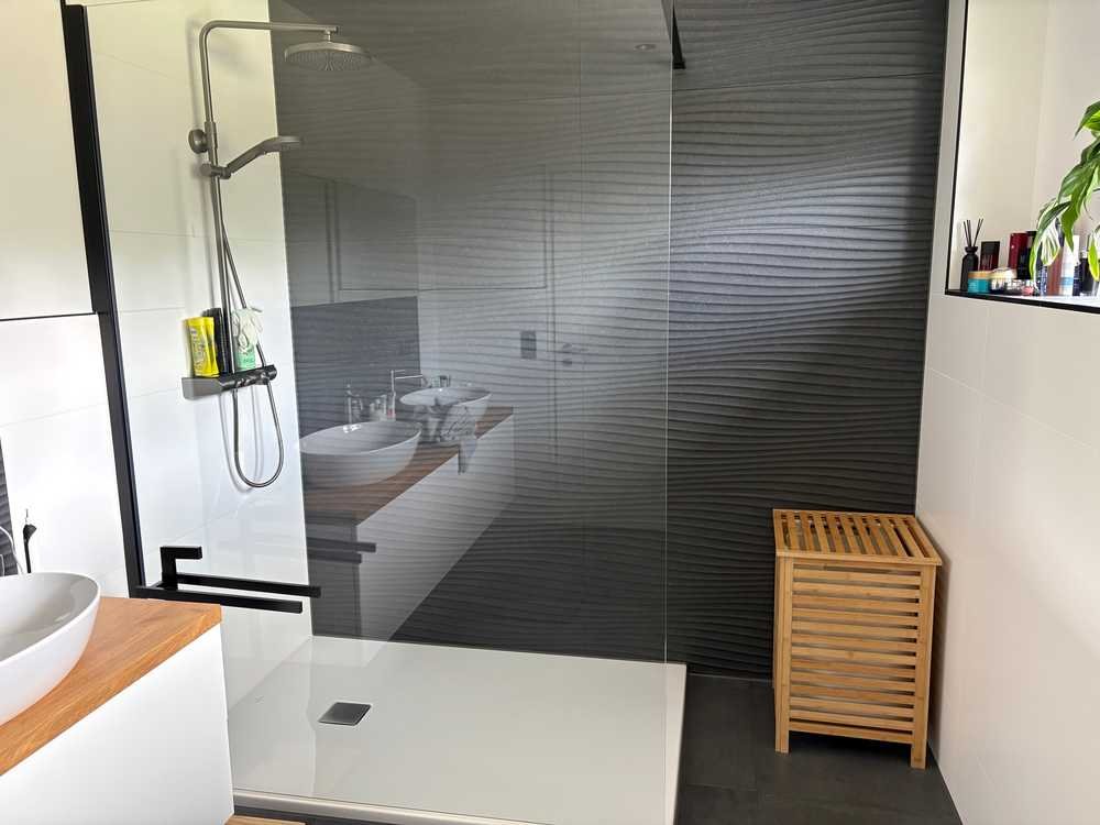 Das moderne Badezimmer im Obergeschoss ist ausgestattet mit einer bodengleichen Dusche, einer Badewanne, einem Waschtisch und einer Toilette.