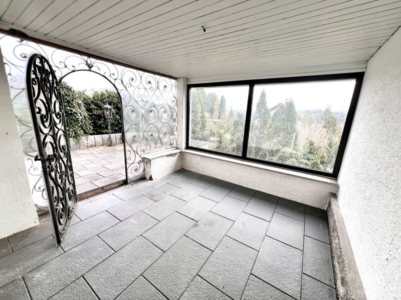 Terrasse mit Markise. Genießen Sie schöne Sommerabende im lichtdurchfluteten Wintergarten. Dieser dient als Freisitz für warme Tage und gewährt einen herrlichen Blick ins Grüne.