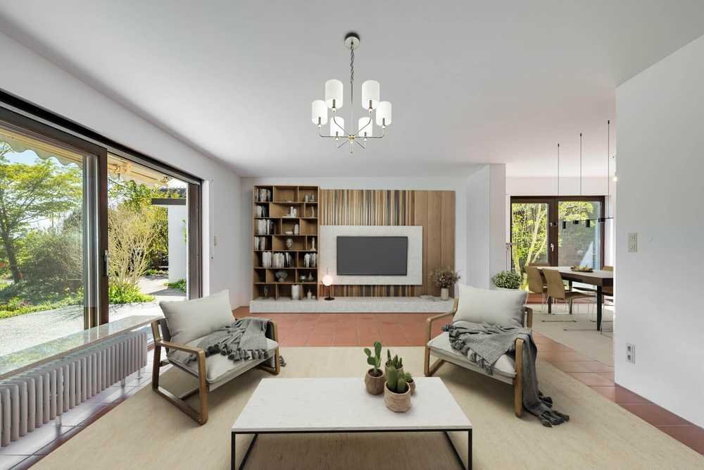 Der großzügige Wohn- und Essbereich bietet viel Raum, um Ihre Vorstellungen von schönem Wohnen zu verwirklichen. In den kalten Monaten werden Sie die angenehme Wärme des Kachelofens genießen, die dank des Kaminschachts auch noch im Obergeschoss zu spüren ist. Direkt an das Wohnzimmer schmiegt sich die sonnige Südterrasse an. So können Sie Ihr Leben an lauschigen Sommertagen bequem ins Freie verlagern, Feste feiern, entspannen und die wohltuende Wirkung der Natur genießen. Für Kinder bietet der geschützte Garten eine wunderbare Gelegenheit, draußen zu spielen.
