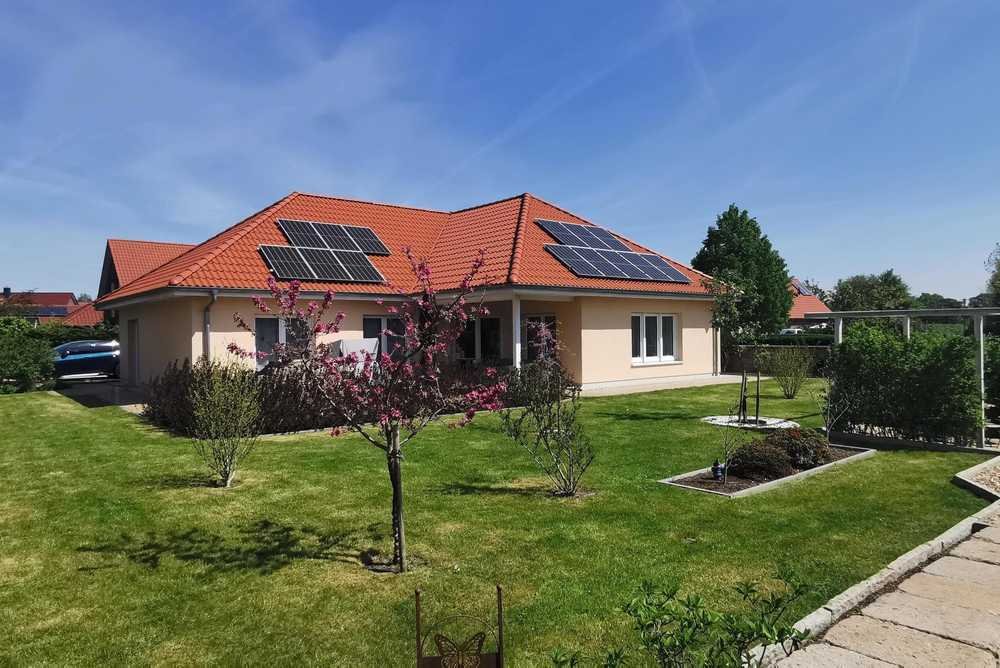 Sie suchen ebenerdiges Wohnen im mediterranen Stil gepaart mit bester Energieeffizienz? Dann sind Sie bei diesem hochmodernen und erst 2017 erbauten KfW40 + Bungalow mit ca. 149 m² Wohnfläche richtig ! Die Technik dieses Hauses läßt nichts zu wünschen übrig. Von der Wärmepumpe über die Belüftungsanlage mit Wärmerückgewinnung, 3-fach verglasten Fenstern, Fußbodenheizung bis hin zur PV-Anlage ( 12,54 kWp ) dem Batteriespeicher ( 17,4 kWh ) und der Wallbox ist dieses Haus technisch wie energetisch auf dem Stand der Höhe und zeichnet sich durch eine Energieeffizienzklasse von " A+ " mit 12,3 kWh/(m²a) Endenergiebedarf aus! Neben der Technik darf aber auch das Ambiente nicht fehlen. Elektr. Rolläden, Smart Home Steuerung, ein großzügiges Bad und moderne Bodenbeläge lassen kaum Wünsche offen! Und alle, die mehr Platz brauchen sind hier auch richtig. Der Dachboden ist ausbaubar, ein sogenannter Wechsel zum Einbau einer Treppe aus der Diele heraus ins DG ist bereits vorhanden! Ferner haben die jetzigen Eigentümer mit viel Liebe den Garten, die Terrasse und die Einfriedung in einem mediterranen Stil angelegt, der zum langen Verweilen anregt. Ein Gartenhaus, ein elektrisches Einfahrtstor, 2 Stellplätze mit Wallboxanschluß ( Baugenehmigung für Doppelgarage liegt vor ) runden das Angebot ab. Fordern Sie bitte das Exposee an. Im Anschluß daran kann dann gerne eine Besichtigung vereinbart werden!