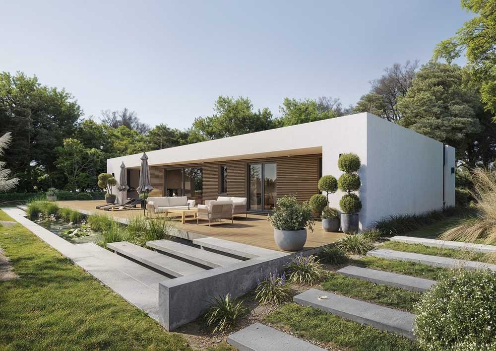 Dieser Bungalow verfügt über eine hochmoderne Architektur bei effizienter Ausnutzung der Grundfläche. Durch die großzügig gestalteten Fensterflächen wirken alle Bereiche hell und freundlich. Im Sommer bieten die großen Dachüberstände im Außenbereich angenehmen Schatten.