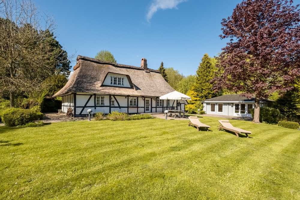 Ein exklusiver Wohntraum im Grünen! Beim Betreten dieses einzigartigen Anwesens werden Sie sofort von einer unvergleichlichen Atmosphäre erfasst, die den Charme der Geschichte mit ruhiger Eleganz vereint. Die weitläufige Landschaft und die liebevoll restaurierten Gebäude schaffen Geborgenheit und Weite zugleich. Das gesamte Anwesen strahlt eine außergewöhnliche Ruhe und Harmonie aus, die den Besucher auf Schritt und Tritt in seinen Bann zieht. Dieses außergewöhnliche Ensemble erstreckt sich über ca. 1,3 Hektar und ist in liebevoll gestaltete Bereiche unterteilt. Die ca. 5.000 m² großen, eingezäunten Koppeln sind ideal für Tierbesitzer. Zahlreiche Rückzugsorte bieten Gelegenheit zur Ruhe – sei es am Teich, am Fluss, an der Scheune mit Blick über die Koppeln oder unter dem Rot-Ahorn auf einer Teakholz-Gartenliege. Ein parkähnlicher Garten mit idyllischen Teichen und ein separater Bereich mit Tiergehegen und Wirtschaftsgebäuden unterstreichen die ländliche Stimmung. Auf dem Gelände befinden sich mehrere Wohngebäude, darunter ein bezauberndes Reetdachhaus aus dem 18. Jahrhundert, ein gemütliches Gästehaus und eine rund 200 Jahre alte Scheune. Alle Gebäude wurden 1991 hochwertig kernsaniert.