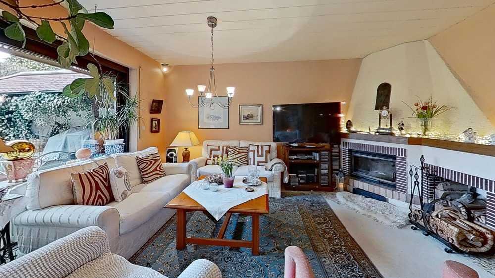 Das Erdgeschoss mit ca. 83,3 m² präsentiert ein helles und luftiges Wohnzimmer mit großen Fenstern, die den Raum mit natürlichem Licht durchfluten. Ein bemerkenswertes Merkmal ist die große Glastür mit Mahagonirahmen, die eine nahtlose Verbindung zum großen Garten bietet.