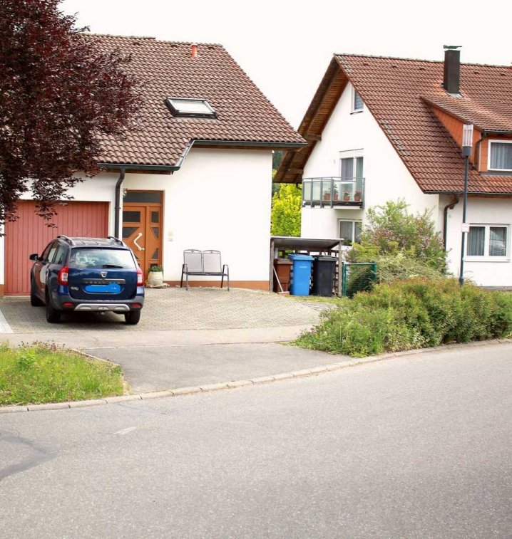 Es befinden sich Stellfläche vor dem Gebäude und eine integrierte Garage im Haus.