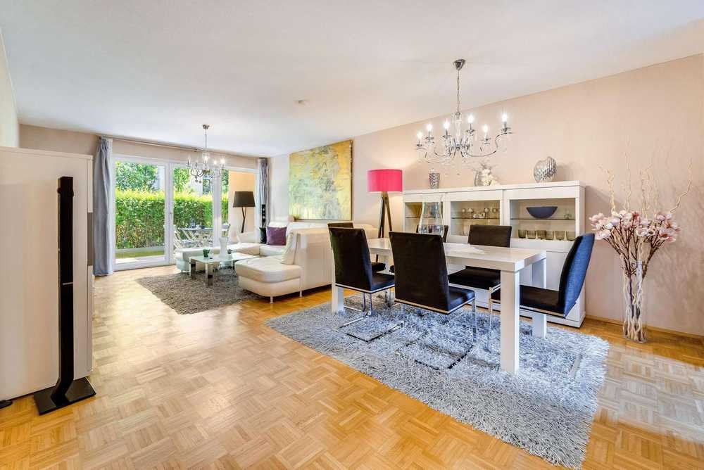 Das Herzstück der Wohnung ist der großzügige Wohn-/Essbereich mit offener Küche und Zugang zu beiden Terrassen (Nordterrasse und Südterrasse). Die Wohnung verfügt über raumhohe Fenster, so dass man auch über die beiden gut nutzbaren Schlafzimmer Zugang zur Gartenfläche hat.