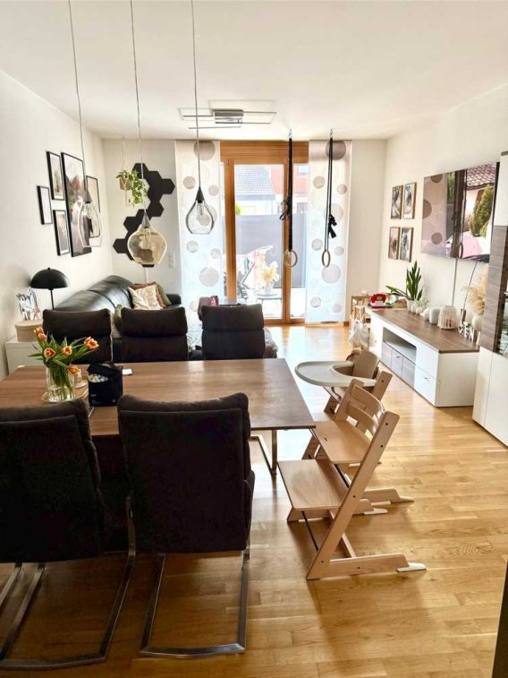 Das lichtdurchflutete Wohnzimmer mit seinen großzügigen Fenstern geht nahtlos in eine offen gestaltete, voll ausgestattete Küche über, die zum gemeinsamen Kochen einlädt.