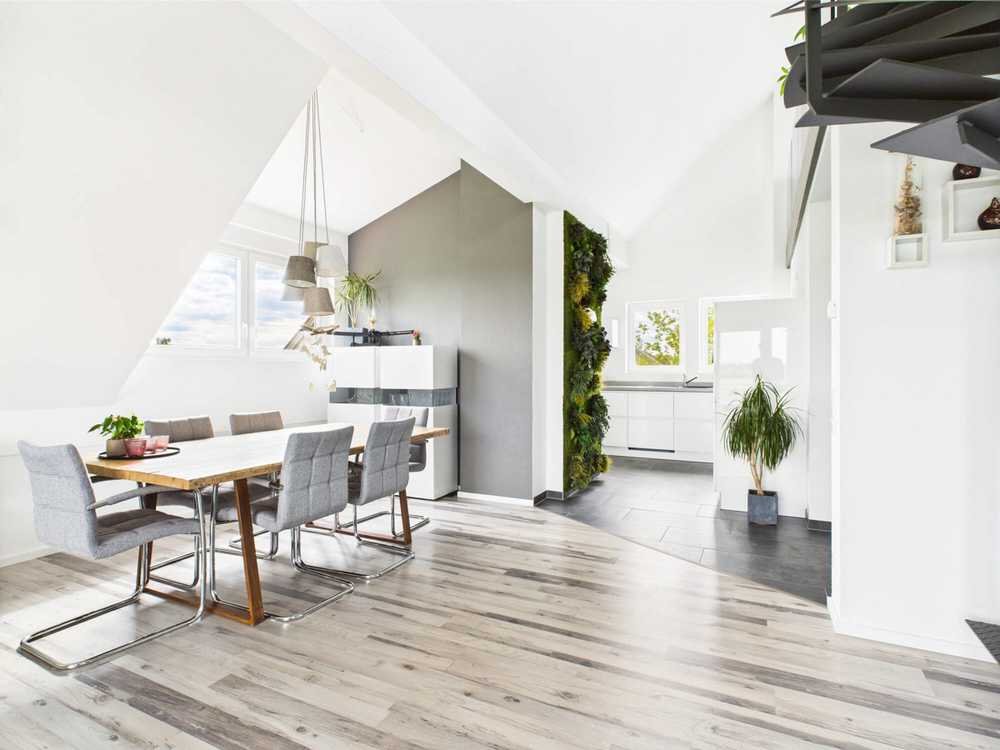 Die maßgefertigte Hochglanz-Einbauküche ist ein Meisterwerk der Funktionalität, ausgestattet mit Bora Abluft und hochwertigen Elektrogeräten. Eine Original Style Green Pflanzwand im Küchenbereich unterstreichen den hohen Qualitätsanspruch eine Perla Enthärtungsanlage runden das Angebot ab. Die angrenzende Speisekammer bietet praktischen Stauraum.