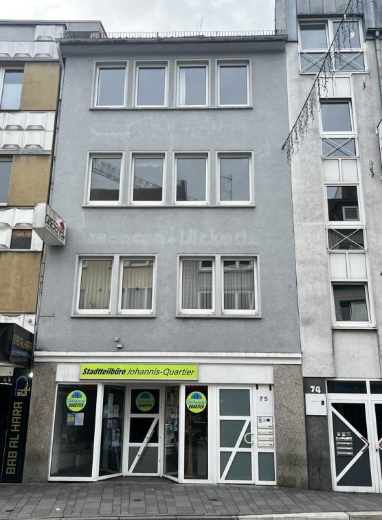 Das Objekt kann sowohl von der Johannisstraße als auch von der Seminarstraße begangen werden. Der Eingang von der Johannisstraße befindet sich seitlich neben dem Ladenlokal (ca. 65 m2) und führt über einen Flur zum Treppenhaus, das durch eine weitere Eingangstür zu erreichen ist. Der Zugang von der Seminarstraße erfolgt über den Innenhof und Hausflur, der ebenfalls zum Treppenhaus führt. Im Erdgeschoss befindet sich noch ein weiterer Raum mit einer Größe von ca. 23,50 m2, der zurzeit nicht vermietet und renovierungsbedürftig ist.