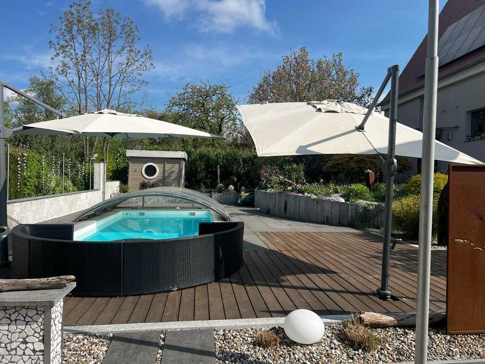 Der Pool- / Loungebereich besteht aus dem 8 x 4 m großen Pool, einer Außendusche, Außensauna und einer herrlichen mit Glasdach überdachten Terrasse. Bei dem Pool handelt es sich um einen Salz-Elektrolyse-Pool mit einer Winterabdeckung die im Sommer komplett entfernt werden kann.