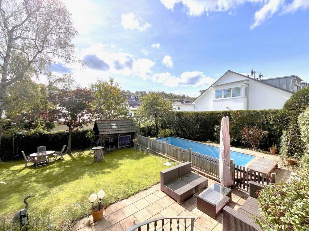 Die Immobilie kombiniert eine außergewöhnliche Südhanglage mit einer Gartenanlage, die durch älteren Baum- und Buschbestand sehr schön eingegrünt ist. Der gepflegte Garten ist vom Wohnzimmer oder Untergeschoß aus direkt über Treppen durch einen großzügig bepflanzten Terrassenhang bequem erreichbar. Mit der Terrasse, einem großen Pool und Teich bietet der Garten mit seiner großen Rasenfläche genügend Platz für Spielgeräte und gemütliche Stunden im Freien.