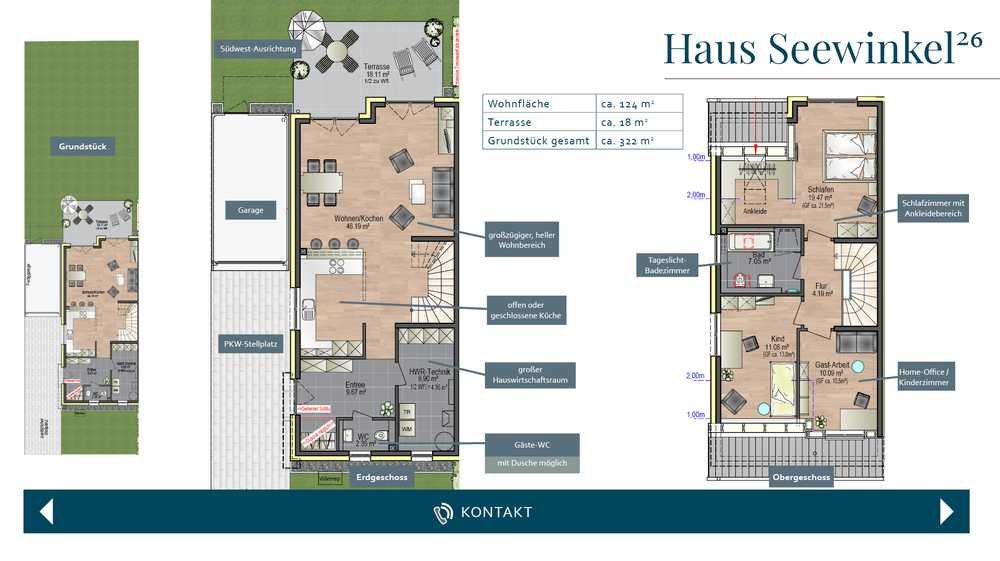 Der offene Wohn-/Essbereich mit ca. 46 m², große Fensterflächen und ein direkter Zugang zur sonnigen Südwest-Terrasse schaffen ein angenehmes Wohngefühl. Ein Tageslichtbad, Gäste-WC, flexible Nutzungsmöglichkeiten (z. B. Home-Office) und ein eigener Garten runden das Angebot ab.