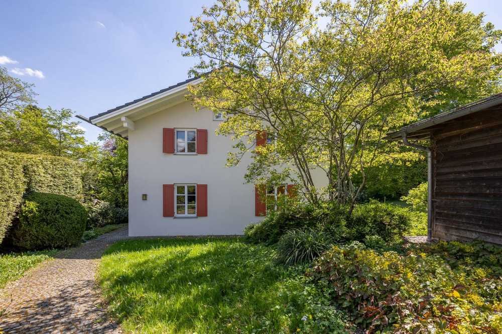 HERZ I Das Herzstück des Hauses bildet das großzügige Wohnzimmer, das durch seine zahlreichen Fenster lichtdurchflutet ist und fast den Charakter eines Salons hat. Ein Kachelofen sorgt in der kalten Jahreszeit für behagliche Stunden, während maßgefertigte Regale Platz für Bücher, Kunstobjekte und Erinnerungsstücke bieten – ganz ohne übermäßige Möblierung. Zwei verglaste Doppeltüren öffnen den Raum zu den beiden Terrassen des Hauses: Der Garten in süd-östlicher Ausrichtung lädt mit Rasenfläche, Spielmöglichkeiten und einer gemütlichen Grillecke zum Verweilen ein.