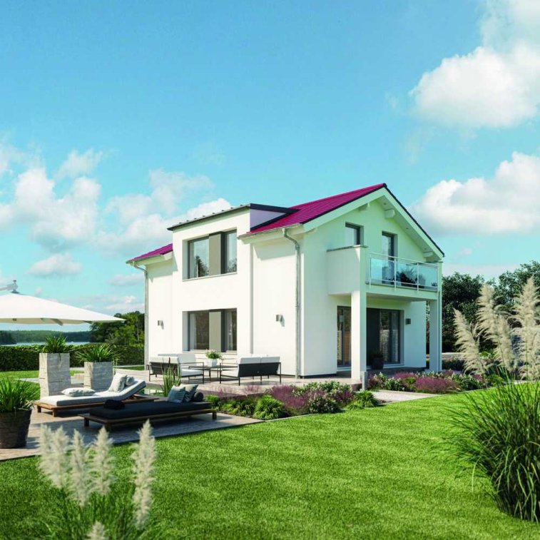 Das Einfamilienhaus mit Satteldach ist nach wie vor der am häufigsten gebaute Haustyp. Kein Wunder, bringt diese Dachform doch zahlreiche Vorteile mit sich: Zum einen ist sie einfach in ihrer Konstruktion, zum anderen nahezu überall baurechtlich umsetzbar. Dabei eröffnet die moderne Satteldacharchitektur einen großen Gestaltungsspielraum. Ob weite Dachüberstände oder ganz ohne, ob steil oder flach geneigt: Stilgerecht erfüllt das Dach die individuellen Ansprüche der Bauherren. Bei diesem Hausentwurf sorgt die flache Neigung im Zusammenspiel mit dem pultdachgekrönten Zwerchgiebel für ein sehr modernes, geradliniges Erscheinungsbild. Weite Dachüberstände und die leuchtend rote Eindeckung knüpfen an die traditionelle Bauweise an. Damit passt sich das Fertighaus auch in gewachsene Baugebiete harmonisch ein. Ein schönes Detail ist der von Stützen getragene Balkon, der das Dachgeschoss um ein sonniges Plätzchen unter freiem Himmel erweitert und die Terrasse zudem vor Regen schützt. Das Innere des Hauses überzeugt mit einem klaren, leicht verständlichen Grundriss, der sich am Alltag einer vierköpfigen Familie orientiert. Empfangen werden die Bewohner und Besucher von einer geräumigen Diele, in der sich auch mehrere Personen gleichzeitig aufhalten können, ohne dass Gedränge entsteht. Rechts schließt sich der Technikraum und links das Gäste-WC an. Über einen offen Durchgang gelangt man von der Diele direkt in den Wohn- und Essbereich, wo man es sich entweder am großen Esstisch oder auf der Couch gemütlich machen kann. Die Küche wurde über Eck halboffen an das Raumensemble angegliedert. So haben Gäste nicht ständig Töpfe und Geschirr im Blick. Vorräte und andere Dinge, die man nicht täglich benötigt, verschwinden ordentlich in der Abstellkammer unter der viertelgewendelten Treppe. Das Dachgeschoss ist für die Privaträume reserviert. Die Wohnfläche teilen sich zwei große Kinderzimmer, der Elternschlafraum sowie ein schönes Familienbad mit ausreichend Platz für eine Wanne und eine bodengleiche Dusche im XL-Format.