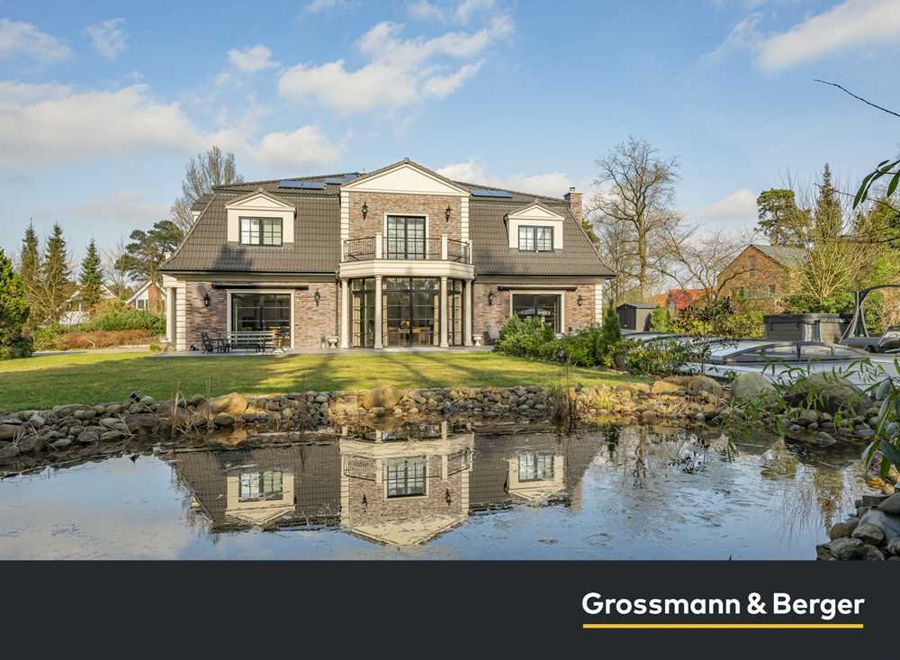 Über eine repräsentative Zufahrt erreichen Sie das neuwertige Villenanwesen, das exklusiven Wohnkomfort mit stilvollem Design und modernster Technik verbindet. Erbaut wurde die Immobilie im Jahr 2022 auf einem weitläufigen Grundstück von ca. 3.954 m² mit zwei Teichen und einem überdachten Außenpool. Die Architektur des Hauses besticht durch eine charaktervolle Eleganz und hochwertigste Materialien. Zur technischen Gebäudeausstattung gehören unter anderem eine Wärmepumpe mit einem Pufferspeicher sowie eine Photovoltaikanlage mit einem Batteriespeicher, Fußbodenheizung im Erd- und Dachgeschoss sowie ein hochwertiger Kamin mit einer elektronischen Steuerung. Der Garten punktet mit den Wasserflächen der beiden Teiche und seiner sommerlichen Blütenpracht. Star des Gartens ist der beheizbare Pool mit einer ausfahrbaren Überdachung, damit das Schwimmvergnügen zu jeder Jahreszeit möglich wird, aber auch ein Outdoor Jacuzzi lädt ganzjährig zum Relaxen ein. Diese Villa ist somit nicht nur ein Zuhause, sondern ein Lebensgefühl. Eine bestens gelungene Kombination aus zeitloser Wertigkeit, Wärme und Luxus.
