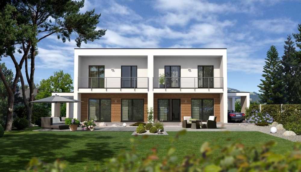 Moderne Eleganz im Bauhausstil bietet der Hausentwurf TWIN mit Flachdach. An der Gartenseite