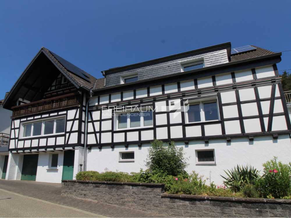 Das im Jahr 1947 errichtete Zweifamilienwohnhaus wurde im Jahr 1987 um einen Anbau erweitert. Somit entstanden zwei großzügige Wohnungen mit einer Wohnfläche von jeweils ca. 117 m². Im Zuge des Anbaus wurde auch der Altbau aufwändig und mit viel Sachverstand renoviert. Eine Außentreppe führt zu einem wohnlichen Windfang und zum Hauseingang. Die Wohnung im Erdgeschoss hat eine überdachte Terrasse zur Gartenseite, die Wohnung im Dachgeschoss hat eine sonnige Loggia zur Talseite, mit unverbaubarem Fernblick. Beide Wohnungen verfügen über große Wohn-/Esszimmer und helle Küchen mit der Möglichkeit zusätzliche Essbereiche einzurichten. In der Erdgeschosswohnung befindet sich zwischen der Küche und dem offenen Wohnbereich ein moderner Kachelofen. Dieser sorgt für behagliche Wärme in der kalten Jahreszeit. Auch in der Dachgeschosswohnung gibt es im Wohnzimmer einen gemütlichen Kachelofen. Dieser wird aus einem kleinen Nebenflur befeuert. Beide Wohnungen haben jeweils ein großes und zwei kleine Schlafzimmer, welche auch als Büros oder Gästezimmer genutzt werden können. Auch wurden in beiden Wohnungen moderne Duschbäder eingebaut. Flure führen aus beiden Wohnungen in's gemeinschaftliche Treppenhaus. Auf den Zwischenpodesten der Treppe befinden sich noch zwei unrenovierte Gäste-WCs. Im Obergeschoss kann man vom Treppenhaus aus einen Balkon mit Blick in den Garten betreten. Außerdem führt vom Treppenhaus eine Spindeltreppe in's Dachgeschoss. Hier befindet sich die Technik der Photovoltaikanlagen. Mit dem Einbau von Wandschränken wurde hier jede Menge Stauraum geschaffen. Im Anbau wurde ein Zimmer über die gesamte Gebäudetiefe mit zwei Fenstergiebeln ausgebaut (Nutzfläche). Das Kellergeschoss bietet 3 große Kellerräume und einen kleinen. Im Wasch- und trockenraum befindet sich der Warmwasserspeicher. Ein Zugang in den Anbau ist auch auf dieser Ebene möglich. Man erreicht eine Werkstatt mit Außentür zur Straße und einer Tür direkt in die Doppelgarage mit Wall-Box. In den gepflegten Garten gelangt man entweder über die Terrasse der Erdgeschosswohnung oder über eine Außentreppe an der Eingangsfassade. Eine Gartentreppe wurde mit Findlingen angelegt. Dieser originelle Weg führt zu einer sonnigen Terrasse im oberen Grundstücksbereich. Hier öffnet ein Gartentörchen den Zugang in nahezu endlose Natur. Eine Gartenhütte bietet Stauraum für Gartengeräte und Brennholz. Von der gepflegten Rasenfläche aus genießt man einen wunderschönen Fernblick. Ein lauschiges Plätzchen mit wilden Erdbeeren und einer Gartenbank lädt hier zum Verweilen ein.