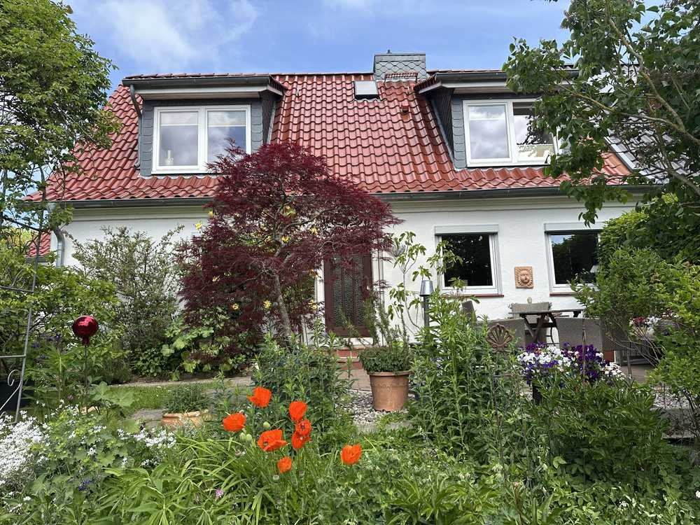 Der Eingangsbereich befindet sich auf der zum Garten gewandten Seite des Hauses. Dort erwartet Sie der Ausblick in den geschmackvoll gestalteten Garten sowie in die umliegende Natur. Die Terrasse und der eingewachsene Garten nach Süden sind ein highlight dieses Immobilienangebotes!