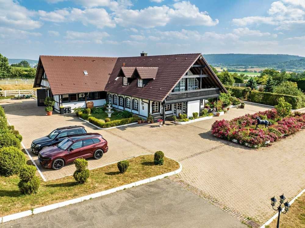 Dieses exklusive Anwesen bietet auf einer Grundstücksfläche von ca. 32.795 m² alles, was das Herz eines Pferdeliebhabers höher schlagen lässt. Das weitläufige Gelände ist stilvoll angelegt und komplett eingezäunt, um absolute Privatsphäre und Sicherheit zu gewährleisten. Ein elektrisches Tor ermöglicht die bequeme Zufahrt zum Anwesen. Das Hauptgebäude beeindruckt mit ca. 300 m² Wohnfläche, die sich auf zwei großzügige Wohneinheiten verteilt. Neben dem hochwertigen Wohnbereich mit offenem Kamin und tollen bodentiefen Sprossenfenstern, verfügt das Haus über einen angrenzenden Stall, der Platz für bis zu 11 Pferde bietet – ideal für eine private Pferdehaltung oder professionelle Zucht. Das Anwesen ist hervorragend ausgestattet: Ein 20x60 m großer Reitplatz mit professionellem Unterbau und Drainage bietet beste Bedingungen für das tägliche Training. Ein 20x20 m Logierzirkel, drei Winterpaddocks sowie acht Sommerkoppeln sorgen für ideale Haltungsbedingungen der Pferde zu jeder Jahreszeit. Ein Nebengebäude ergänzt das Ensemble und bietet eine großzügige Scheune, eine Werkstatt sowie Garagenplätze für Fahrzeuge und landwirtschaftliche Geräte. Im Dachgeschoss befindet sich zudem eine charmante Wohnung mit ca. 90 m² Wohnfläche, die sich optimal als Gästewohnung oder Personalunterkunft eignet. Fast alle Koppeln sowie der Reitplatz sind von hochwertigen weißen Koppelzäunen eingefasst, die dem Grundstück einen eleganten und stilvollen Charakter verleihen. Die idyllische Lage und die hochwertigen Ausstattungen machen dieses Anwesen zu einem einzigartigen Rückzugsort für Pferdefreunde, die Komfort, Natur und erstklassige Reitmöglichkeiten schätzen.