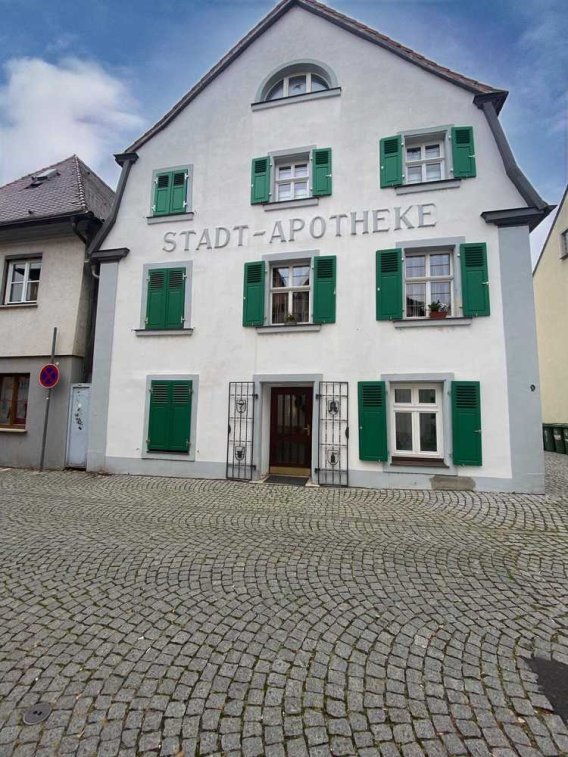 Wohn- und Geschäftshaus, Stadtapotheke Zweigeschossiger giebelständiger Mansarddachbau, erste Hälfte 19. Jahrhundert