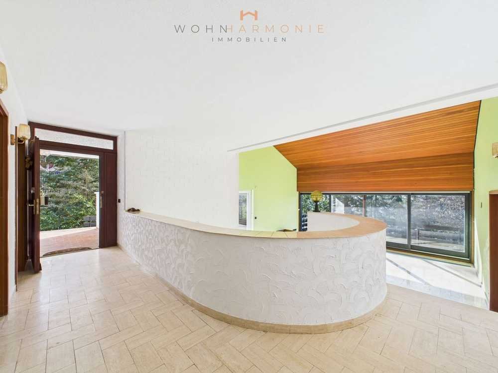 Eines der Highlights ist sicherlich das weitläufige Wohnzimmer, das mit seiner offenen Gestaltung und besonderen Architektur beeindruckt. Große Fensterflächen lassen viel Tageslicht herein und schaffen eine harmonische Verbindung zwischen Innen- und Außenbereich. Die hohe, mit Holz verkleidete Decke verleiht dem Raum eine warme und einladende Atmosphäre. Eine stilvolle Empore setzt architektonische Akzente und bietet vielseitige Gestaltungsmöglichkeiten. Dieses Wohnzimmer lädt dazu ein, individuelle Wohnträume zu verwirklichen und wird garantiert zum Mittelpunkt des Hauses.