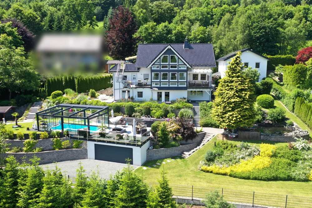Der Hauswirtschaftsraum komplettiert das Raumangebot im Erdgeschoss und bietet mit seinen Stellplätzen für Waschmaschine und Trockner, kurze Wege. In der oberen Etage befindet sich das Elternschlafzimmer, sowie ein großes Studio. Das Studio verfügt neben dem schönsten Ausblick in die Weite, einen Anschluss für eine Küche, sodass dieser Raum als separate, kleine Wohnung genutzt werden kann. Ein separater Zugang von Außen über eine Treppe, separieren dieses Studio auf Wunsch, vom Privaten Trakt. Dies bietet ideale Voraussetzung für das unterbringen eines Au-pairs oder Gäste. Für junge Heranwachsende oder der Anspruch an einen Home Office bietet die Einliegerwohnung ideale Voraussetzungen. Über einen separaten Zugang von Außen und Ausgestattet mit drei Zimmern und ein separates Bad schafft diese Einliegerwohnung ideale Voraussetzungen Wohnen und Arbeiten zu vereinen oder einen schönen Rückzugsort für die Kinder zu schaffen. Ein großes Highlight dieses Anwesens ist das weitläufige Grundstück und der eigene Garten. Zur Wellnessoase wird der überdachte Pool dieser ist beheizt und kann somit zu jeder Tages- und Jahreszeit genutzt werden. Für eine energieeffiziente Nutzung sorgt die Luftwärmepumpe die als Energiegeber für den Pool eingesetzt wird. Unter der großen Terrasse befindet sich eine weitere Doppelgarage mit separater Zufahrt, ideal für Gäste oder die Unterbringung des eigenen Fuhrparks. Alles in Allem bietet dieses Domizil, fernab des Trubels der großen Metropolen, einen willkommenen Rückzugsort mit dem idealen Spagat zwischen Abgeschiedenheit und willkommenen Luxus.