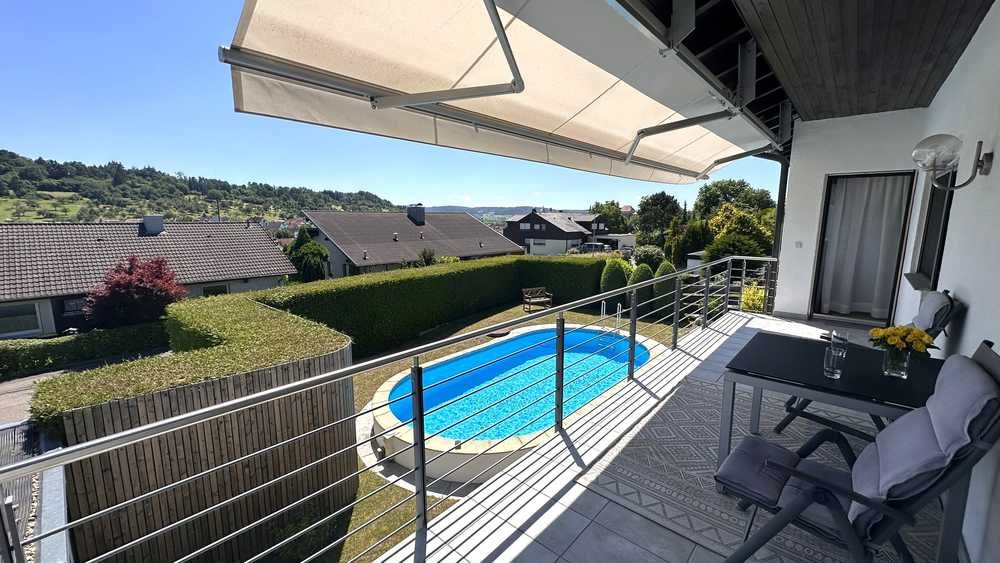 Und neben den schier unerschöpflichen Möglichkeiten im Haus bietet der Freibereich alle Annehmlichkeiten, das Leben bei unterschiedlichster Witterung zu genießen. Bei herrlichem Wetter im schattenspendenden Freisitz bei kühlen Getränken verweilen während die Kinder im Pool toben. Der Freisitz ist übrigens solide Zimmermannsarbeit und der Pool verfügt über eine Solarheizung auf der Doppelgarage sowie aktuelle Filtertechnik in der Garage.