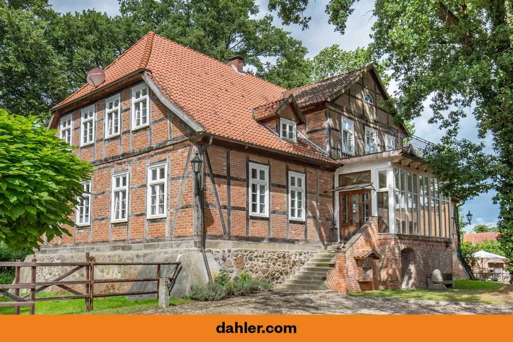 Wohnen erleben. Das außergewöhnliche, alte Burggemäuer mit Gewölbekeller hat einen zweigeschossigen Aufbau mit einem rund 527 m² Wohnfläche umfassenden Fachwerkhaus. 6.323 m² Grundstück sind mit dem alten Burggraben umsäumt. Ein Pferdestall mit drei Boxen und eine Remise für 8 Fahrzeuge wurden 2005 neu errichtet. Die Pferde und Hunde wandeln auf dem rundherum eingezäunten Grundstück, darüber hinaus gibt es eine Tageskoppel in der Größe eines Reitplatzes. Das Wohngebäude wurde 2005 geschmackvoll und sehr luxuriös gemäß Denkmalvorgaben modernisiert.