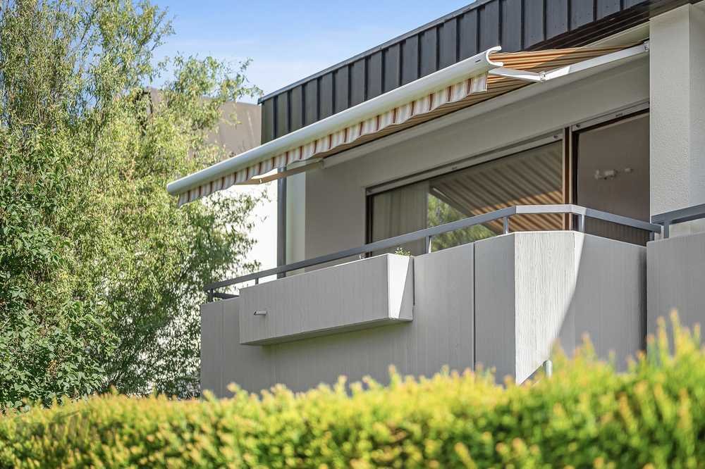 Das Highlight der Wohnung ist das Wohnzimmer mit Panoramafenster inklusive dem großzügigen Balkon, der mit einer Markise ausgestattet ist – ideal für entspannte Stunden im Freien bei Sonnenschein oder im kühleren Schatten.