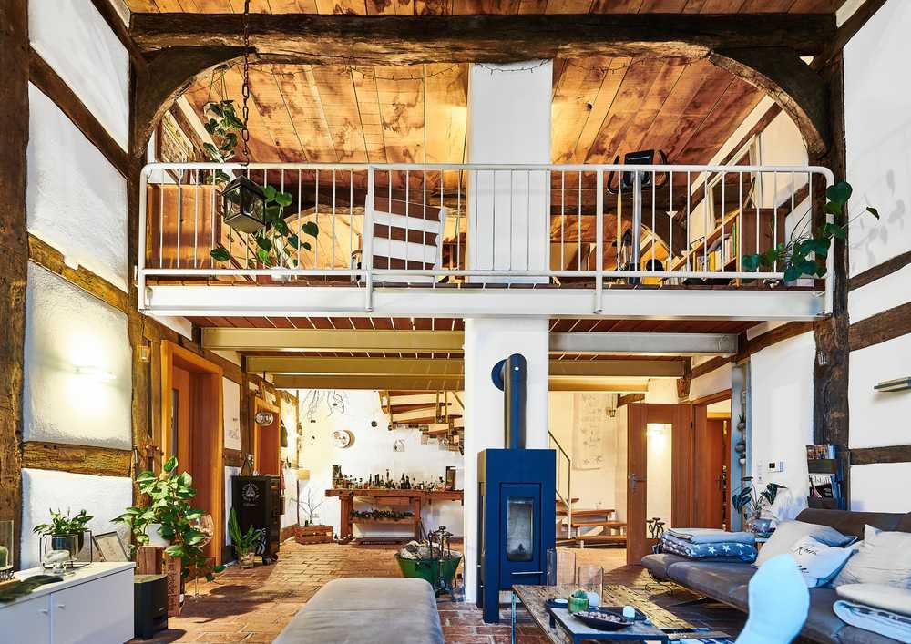 Bereits im Erdgeschoß erwarten Sie die perfekt aufgearbeiteten Steinböden und das gemütliche Fachwerk. Erleben Sie das Raumgefühl des offenen Wohnbereichs mit seinen hohen Decken, der Galerie, direktem Zugang zu Ihrem Garten und dem Ess- und Küchenbereich.