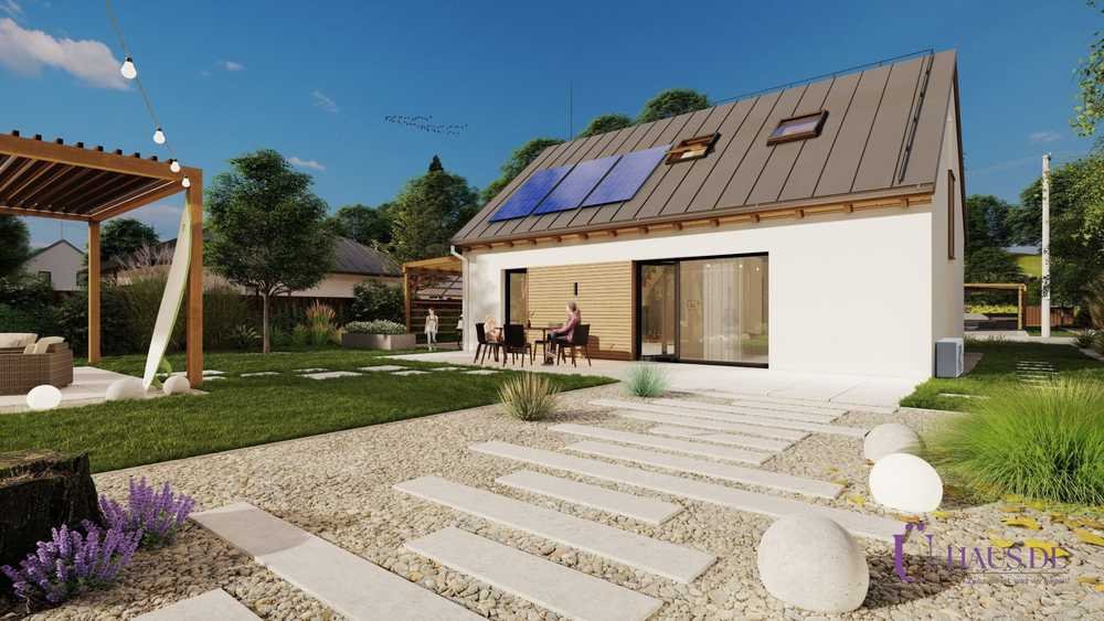 Dank des einfachen rechteckigen Grundrisses von 11,14 × 7,81 m können Sie dieses Haus auf Grundstücken beliebiger Form errichten. Das Satteldach mit klassischen Dachfenstern ohne Gauben oder Erker sorgt ebenfalls für Schlichtheit. Die kompakte Form des Hauses wirkt sich zudem positiv auf die Energieeffizienz aus . Das Haus kann um einen praktischen Stellplatz für ein Auto oder eine Terrasse ergänzt werden. Ein großer Vorteil dieses Hauses ist die Möglichkeit, es bequem um einen Dachboden zu erweitern .