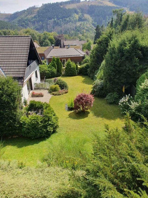 Der liebevoll gepflegte Garten verfügt über einen kleinen Teich und ein praktisches Gartenhaus. Die erhöhte Lage eröffnet einen herrlichen Blick auf den Bocksberg.
